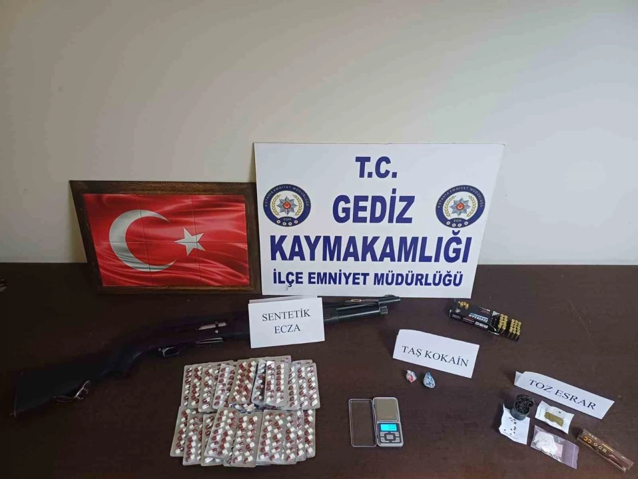 Yürütülen soruşturma kapsamında il dışından Kütahya’ya uyuşturucu madde getireceği tespit edilen şahısların bulunduğu araç, Gediz ilçesi sınırlarında durduruldu. Araçta bulunan S.G. (24), A.S. (32), R.Ç. (36) ve Ö.Ç. (67) yakalanarak gözaltına alındı. Şüphelilerin üzerlerinde, araçlarında ve ikametlerinde yapılan aramalarda; 528 adet sentetik ecza, 2 parça halinde 8 gram taş kokain, 4 gram eroin, 11 adet kenevir tohumu, 1 adet esrar öğütücü, 1 adet hassas terazi, 1 adet ruhsatsız av tüfeği ve 25 adet fişek ele geçirildi.