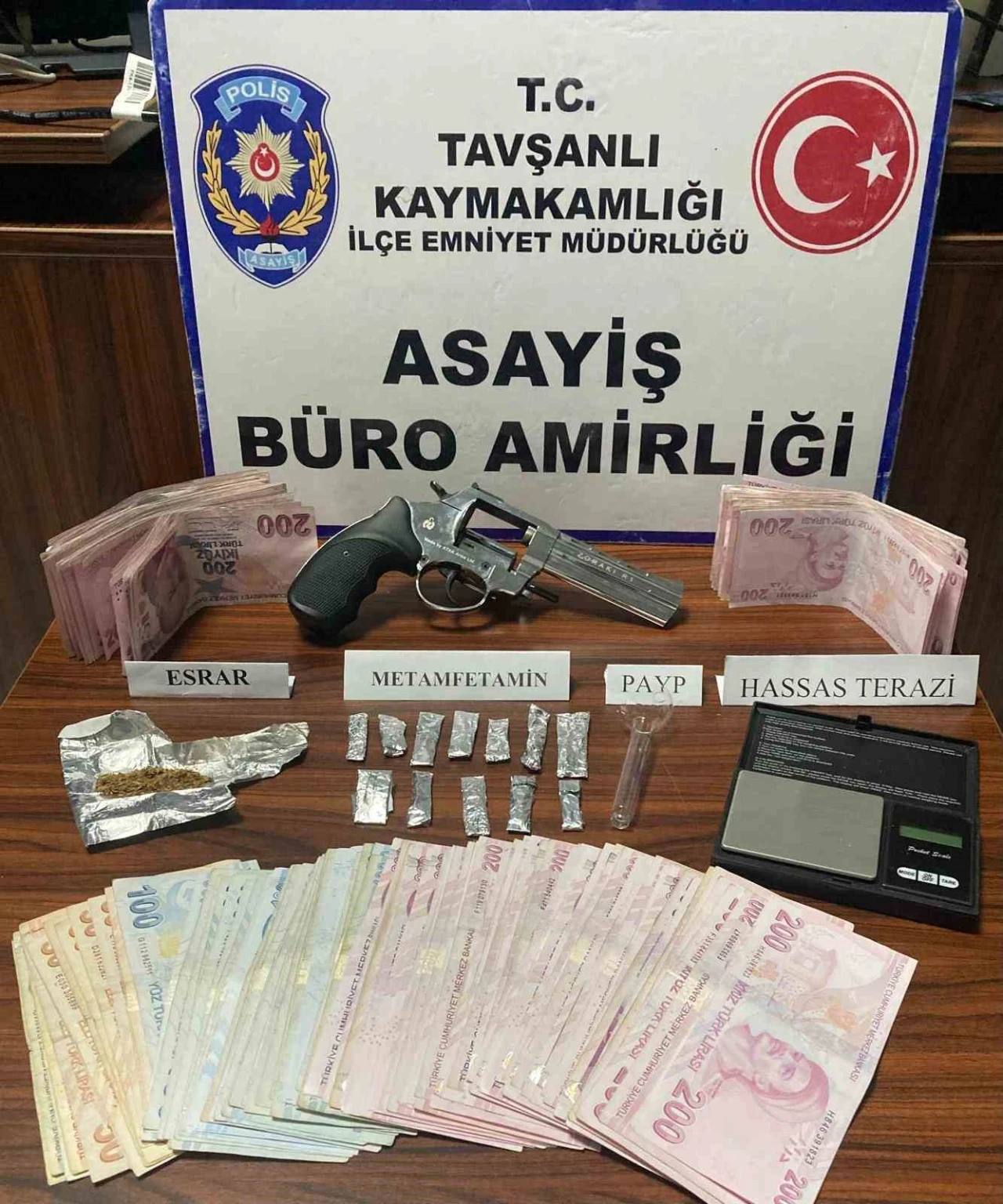 Narkotik Suçlarla Mücadele Şube Müdürlüğü ve Tavşanlı İlçe Emniyet Müdürlüğünün koordineli çalışmaları neticesinde, Tavşanlı ilçesinde uyuşturucu madde ticareti yaptığı tespit edilen B.A. (31) isimli şahsın ikametinde yapılan aramada, satışa hazır vaziyette 12 parça toplam 10.64 gram metamfetamin, 1.42 gram esrar, 1 adet kurusıkı tabanca, 1 adet hassas terazi ve uyuşturucu madde satışından elde edildiği düşünülen 36 bin TL ele geçirildi. Gözaltına alınan B.A., isimli şüpheli emniyetteki işlemlerinin ardından çıkarıldığı mahkemece tutuklanarak cezaevine gönderildi.