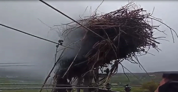 Ardahan’da elektrik direğinin üstündeki leylek yuvası, bilinmeyen bir nedenle çıkan kıvılcımlarla tutuştu. İtfaiye ekipleri alevleri söndürerek leylek yuvası ve yumurtalarını kurtardı.