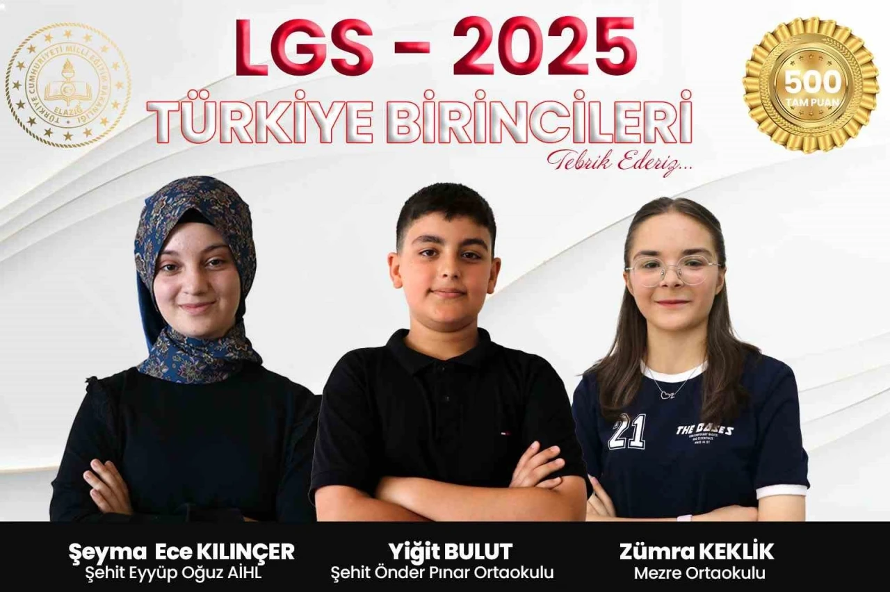 15 Haziran 2025 tarihinde yapılan Ortaöğretim Kurumlarına Öğrenci Seçme Sınavı (LGS) sonuçları bugün açıklandı. Açıklanan sonuçlara göre Şehit Eyyüp Oğuz Anadolu İmam Hatip Lisesi öğrencisi Şeyma Ece Kılınçer, Şehit Önder Pınar Ortaokulu öğrencisi Yiğit Bulut ve Mezre Ortaokulu öğrencisi Zümra Keklik, 500 tam puan alarak Türkiye birincisi oldu. Milli Eğitim Müdürü Mehmet Yiğit önemli bir başarıya imza atan öğrencileri tebrik ederek, "15 Haziran 2025 tarihinde gerçekleştirilen Liselere Geçiş Sistemi (LGS) sınavında, ilimizden üç öğrencimizin 500 tam puan alarak Türkiye Birincisi olması hepimizi gururlandırmıştır. Şehit Eyyüp Oğuz Anadolu İmam Hatip Lisesi’nden Şeyma Ece Kılınçer, Şehit Önder Pınar Ortaokulu’ndan Yiğit Bulut ve Mezre Ortaokulu’ndan Zümra Keklik, gösterdikleri üstün başarıyla Elazığ’ımızın adını en güzel şekilde duyurmuşlardır. Bu büyük başarıda emeği geçen öğrencilerimizi, onların ailelerini, öğretmenlerini ve okul idarecilerimizi yürekten tebrik ediyorum. Öğrencilerimizin azmi, çalışkanlığı ve kararlılığı, ilimizin eğitimdeki gücünü bir kez daha ortaya koymuştur. Bu başarı, sadece öğrencilerimizin değil, aynı zamanda Elazığ’ın eğitimde geldiği noktanın da bir göstergesidir. Sevgili öğrencilerimiz, bu başarınızla geleceğe umutla bakmamızı sağladınız. Sizlerin azmi ve kararlılığı, diğer öğrencilerimize de ilham olacaktır. Gelecekte de aynı disiplin ve gayretle ülkemize ve milletimize büyük katkılar sağlayacağınıza yürekten inanıyorum" dedi.