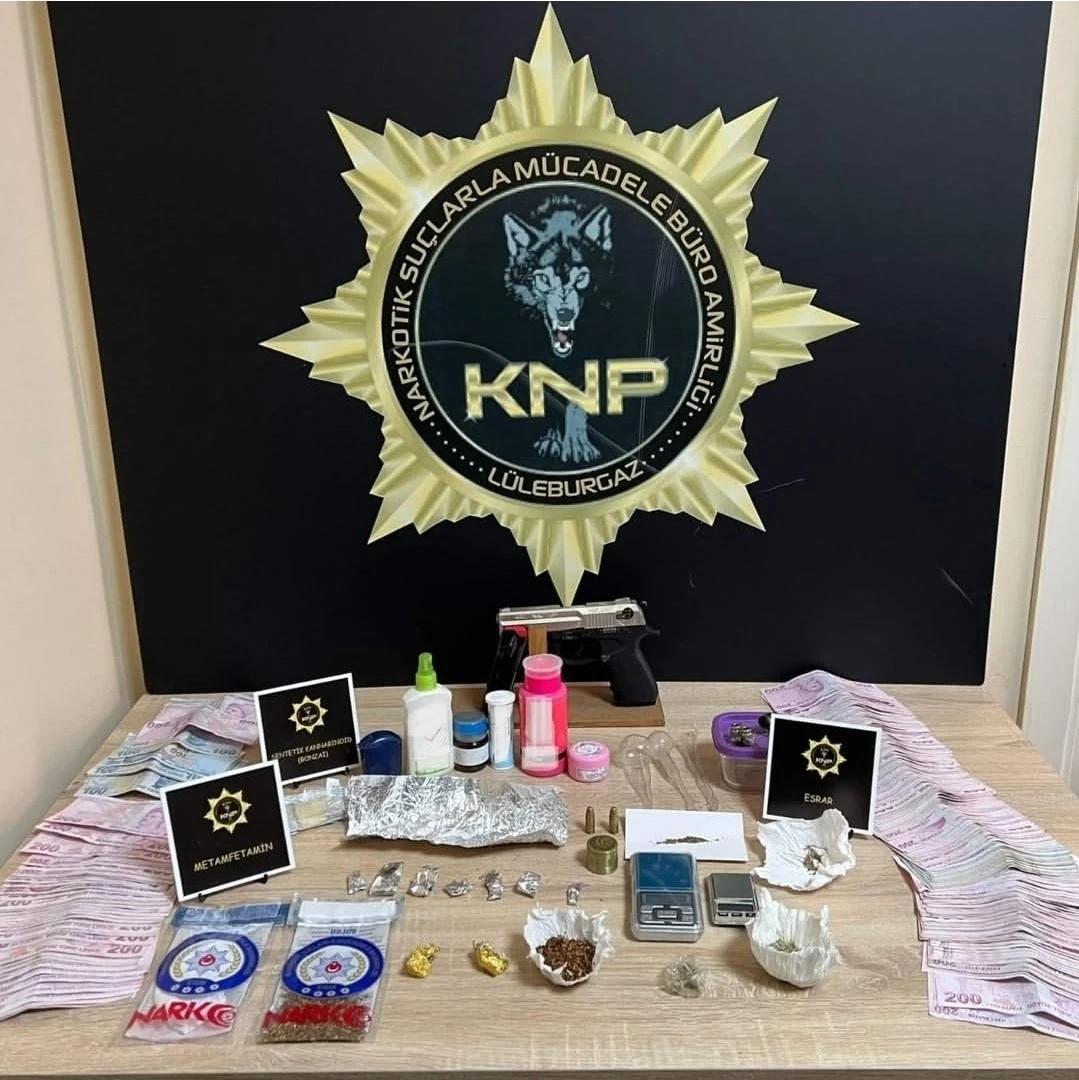 İl Emniyet Müdürlüğü Narkotik Suçlarla Mücadele Şube Müdürlüğü ekiplerince uyuşturucu madde imal ve ticareti yapan şahıslara yönelik Lüleburgaz ilçesinde eş zamanlı operasyon düzenlendi. Operasyonda 12,61 gram metamfetamin, 130,98 gram sıvı sentetik kannabinoid (yaklaşık 3 kilo 994 gram sentetik kannabinoid elde edilebileceği değerlendirilen), 15,83 gram sentetik kannabinoid, 0,93 gram skunk ve 0,11 gram esrar ele geçirildi. Operasyonda ayrıca 3 adet hassas terazi, 1 adet grinder, suçtan elde edildiği değerlendirilen 42 bin 675 TL ile 5 euro, 1 adet tabanca, 2 adet tabanca fişeği ve 4 adet payp ele geçirildi.