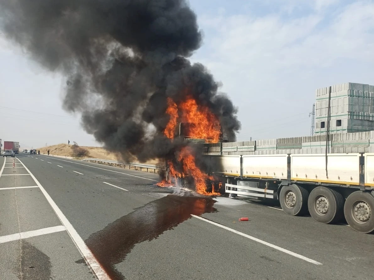 Malatya-Elazığ Karayolu Kale ilçesi mevkiinde inşaat malzemesi yüklü bir tırda çıkan yangın, itfaiye ekiplerince söndürüldü.