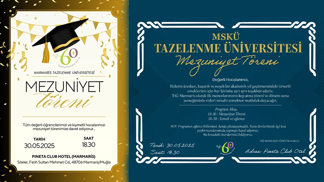 Muğla Tazelenme Üniversitesi, yaşam boyu öğrenme ilkesiyle çıktığı yolda önemli bir dönüm noktasına ulaşıyor. Üniversitenin en kalabalık kampüsü olan Marmaris Tazelenme Kampüsü, yarın akşam (30 Mayıs 2025 Cuma) saat 18:30'da Pineta Club Otel'de düzenleyeceği ilk mezuniyet töreniyle 50 öğrencisini mezun etmenin gururunu yaşayacak.
