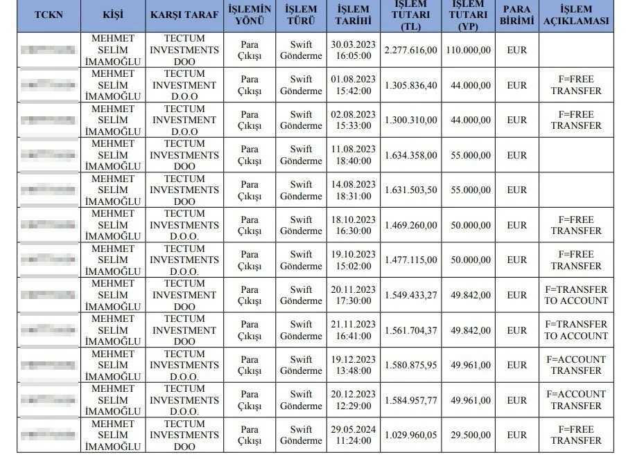 Rapora göre, İmamoğlu’nun oğlu Mehmet Selim İmamoğlu’nun ‘Tectum Investment D.O.O.’ adlı Hırvatistan’daki bir şirkete 2023 ve 2024 yıllarında toplam 637 bin 106 Euro tutarında gönderme işlemi gerçekleştirdiği, Hırvatistan’da yerleşik olan bu şirketin Mehmet Selim İmamoğlu’na ait olduğu aktarıldı. Dilek ve Hasan İmamoğlu’ndan edindiği tutarlarla örtüştüğü kaydedildi