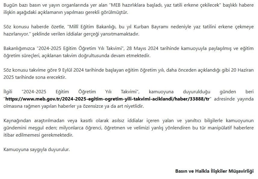 "Söz konusu haberde özetle, ‘Milli Eğitim Bakanlığı, bu yıl Kurban Bayramı nedeniyle yaz tatilini erkene çekmeye hazırlanıyor’ şeklinde verilen iddialar gerçeği yansıtmamaktadır. Bakanlığımızca ’2024-2025 Eğitim Öğretim Yılı Takvimi’, 28 Mayıs 2024 tarihinde kamuoyuyla paylaşılmış ve eğitim öğretim süreçleri, açıklanan takvim doğrultusunda devam etmektedir. Söz konusu takvime göre 9 Eylül 2024 tarihinde başlayan eğitim öğretim yılı, daha önceden açıklandığı gibi 20 Haziran 2025 tarihinde sona erecektir. İlgili ‘2024-2025 Eğitim Öğretim Yılı Takvimi’, kamuoyuna duyurulduğu günden beri ‘https://www.meb.gov.tr/2024-2025-egitim-ogretim-yili-takvimi-aciklandi/haber/33888/tr’ adresinde yayında olmasına rağmen yapılan haberler ya özensizce ya da art niyetlidir. Kaynağından araştırılmadan veya kasıtlı olarak asılsız iddialar içeren yalan ve yanıltıcı bilgilerle kamuoyunun gündemini meşgul eden; milyonlarca öğrenci, öğretmen ve velimizi yanlış yönlendiren bu tür manipülatif haberlere itibar edilmemesi gerekmektedir. Kamuoyuna saygıyla duyurulur."
