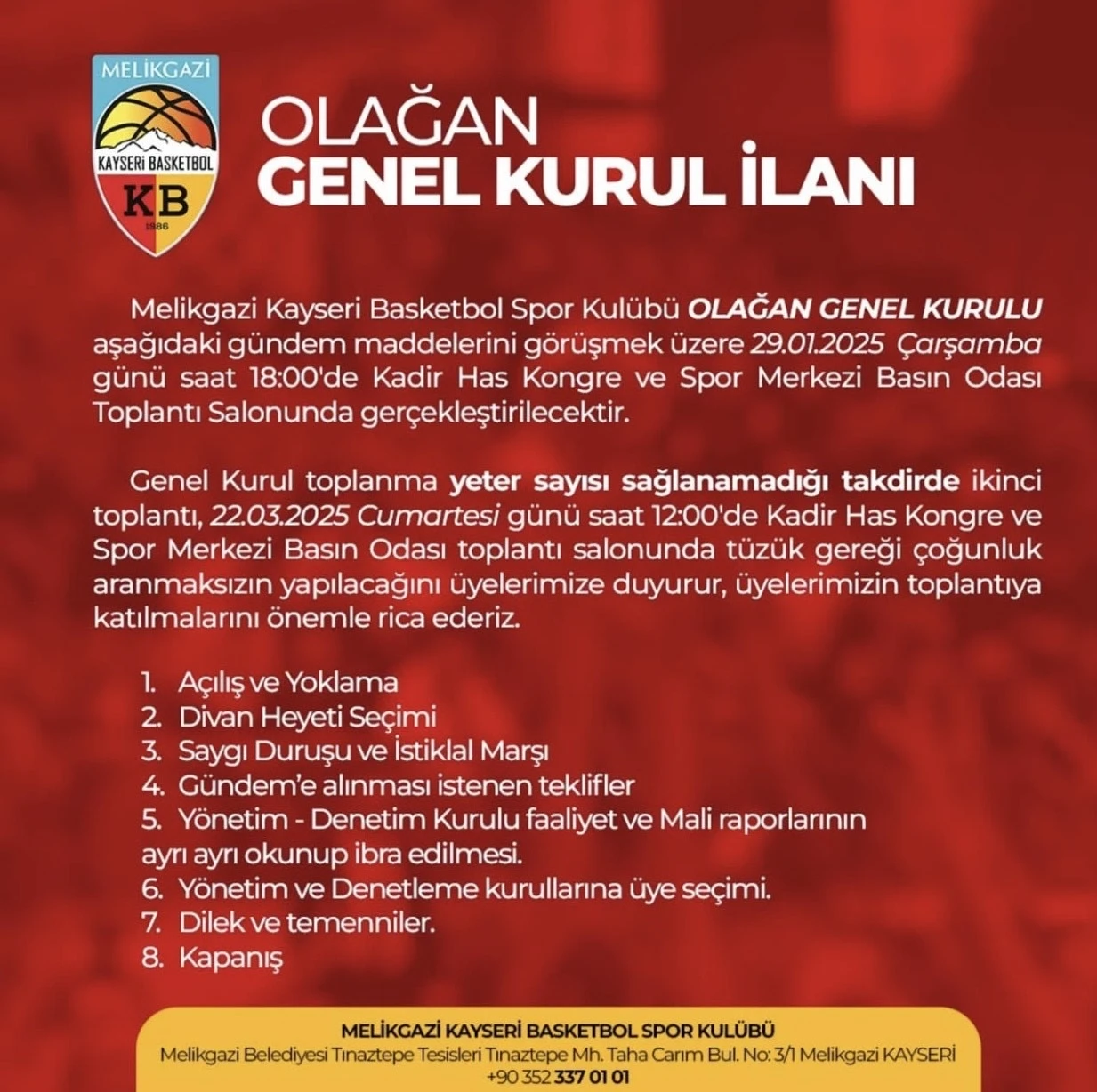 ING Kadınlar Basketbol Süper Ligi takımlarından Melikgazi Kayseri Basketbol Kulübü Olağan Genel Kurul yapacak. Melikgazi Kayseri Basketbol Kulübünden yapılan açıklamada, “Melikgazi Kayseri Basketbol Spor Kulübü Olağan Genel Kurulu birinci toplantı 29 Ocak 2025 Çarşamba Saat 18.00’de Kadir Has Kongre ve Spor Salonunda, çoğunluk sağlanamazsa ikinci toplantı tüzük gereği 22 Mart 2025 Cumartesi saat 12.00’de gerçekleşecek” denildi. Olağan Genel Kurul’da tüzük değişikliği ile yönetim ve denetim kurulunun faaliyet ve mali raporları okunup ibra edilecek.