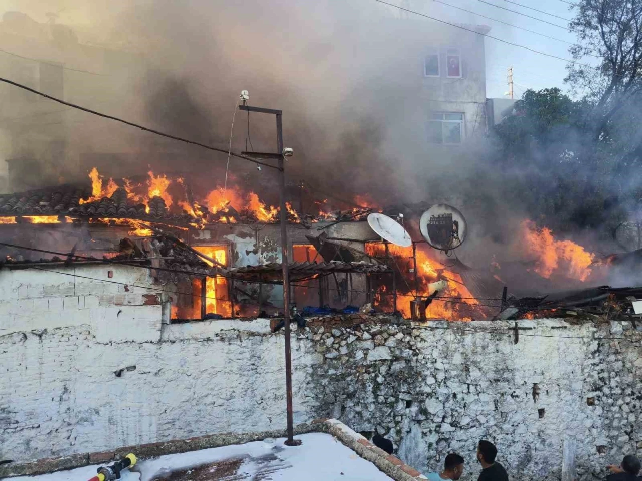 Muğla’nın Menteşe ilçesi Karamehmet Mahallesinde saat 19.00 sıralarında ahşap çatılı evde başlayan yangına itfaiye ekipleri müdahale ediyor.