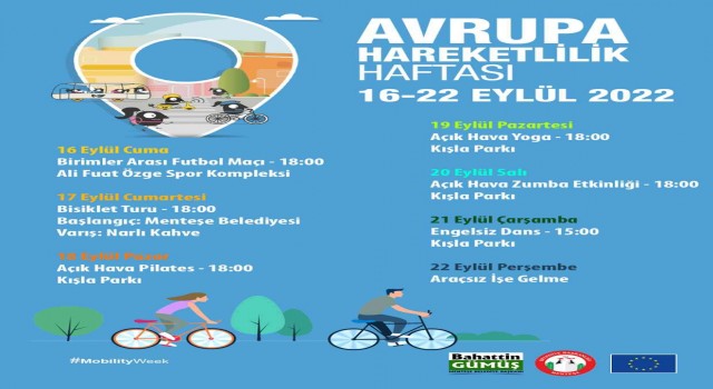 Her yıl tüm Dünya’da 16-22 Eylül tarihleri arasında çeşitli etkinlikler ile kutlanan, vatandaşların bireysel araçlar yerine alternatif ulaşım metotlarını kullanmaya teşvik etmek için düzenlenen Avrupa Hareketlilik Haftası, Menteşe’de bisiklet turu, dans gösterileri, araçsız işe gelme gibi bir dizi etkinlikle kutlanacak.