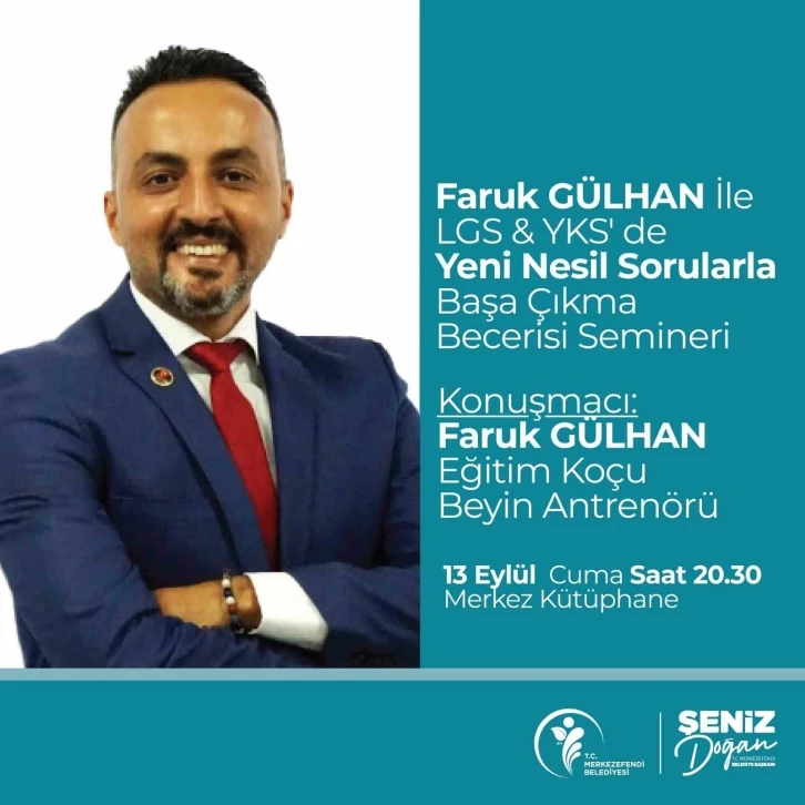 Merkezefendi Belediyesi, öğrencilere yönelik ‘Faruk Gülhan ile LGS-YKS Yeni Nesil Sorularla Başa Çıkma Becerisi Semineri’ düzenliyor. Merkezefendi Belediyesi tarafından düzenlenen, Eğitim Koçu ve Beyin Antrenörü Faruk Gülhan’ın konuşmacı olarak katılacağı; ortaokul ve lise kademesindeki öğrencilere, velilere ve öğretmenlere yönelik ‘Faruk Gülhan İle LGS-YKS’de Yeni Nesil Sorularla Başa Çıkma Becerisi’ semineri gerçekleştirilecek. Öğrencilere yeni sorular üzerine yaklaşımlar, beyin gücünü artıracak faktörler, araştırmalar ve etkileşimli beyin egzersizleri ile keyifli ve öğretici bilgiler vermek amacıyla düzenlenecek olan seminer, 13 Eylül Cuma günü saat 20.30’da Merkez Kütüphane’de gerçekleştirilecek. “Öğrencilerimizin her zaman yanındayız”