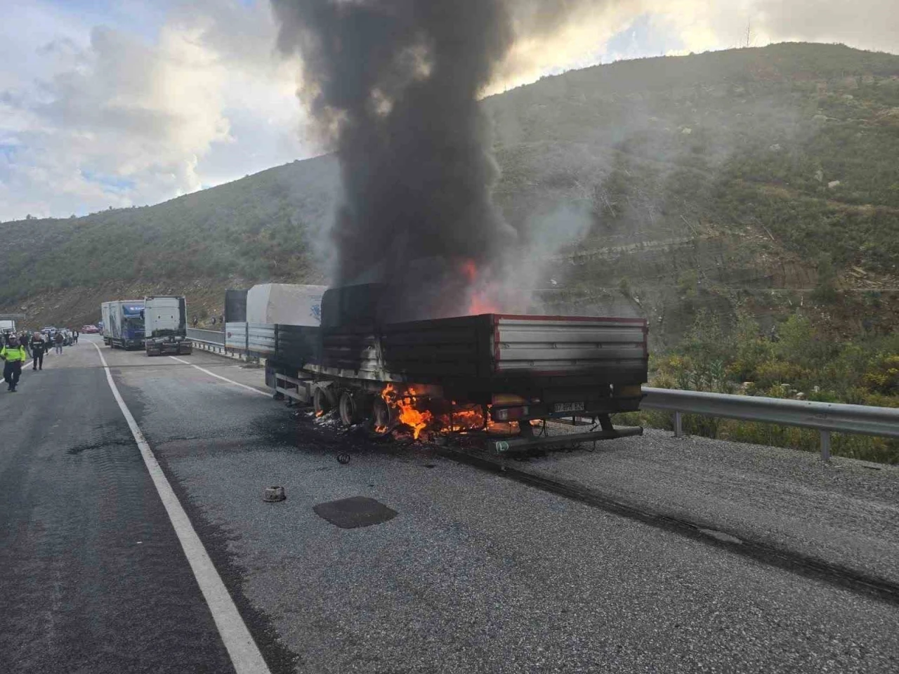 Olay, Konya-Antalya D-687 karayolunda meydana geldi. Edinilen bilgiye göre, Konya’dan Antalya istikametine seyir halindeki Ufuk A.’nın kullandığı 07 BPS 685 plaka, 07 BPM 824 dorse plakalı tırın Demirkapı Tüneli’ni geçtikten sonra dorse kısmından dumanlar yükselmeye başladı. Diğer sürücülerin uyarısı ile dorseden duman yükseldiğini gören tır şoförünün tır ile dorseyi ayırmasının ardından dorseden bir anda alevler yükseldi. Yol trafiğe kapanırken, ihbar üzerine olay yerine Antalya Büyükşehir Belediyesi İtfaiyesi Manavgat Birimi, Trafik Jandarması ve Manavgat İlçe Jandarma Komutanlığı Taşağıl Jandarma Karakolu ekipleri sevk edildi. İtfaiye ekiplerince söndürülen yangında dorse kullanılamaz hale geldi.