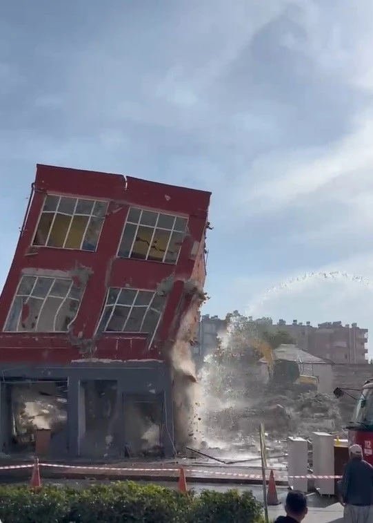 Alınan bilgiye göre, Şehit Mustafa Mahallesi Cumhuriyet Caddesinde bulunan 2 katlı bina depremde ağır hasar aldı. Yerinde dönüşüme alınarak yıkım kararı verilen bina için kontrollü yıkıma başlandı. Gerekli tedbirlerin alınmasından sonra kent merkezinde bulunan binanın titretme yöntemiyle yıkılması uygun görüldü. Binayı yıkmak için gelen iş makinesi, 2 katlı yapıya dokunmadan titreşimle binayı yıktı. Titreşim ile yıkılan 2 katlı binada toz bulutları oluştu.