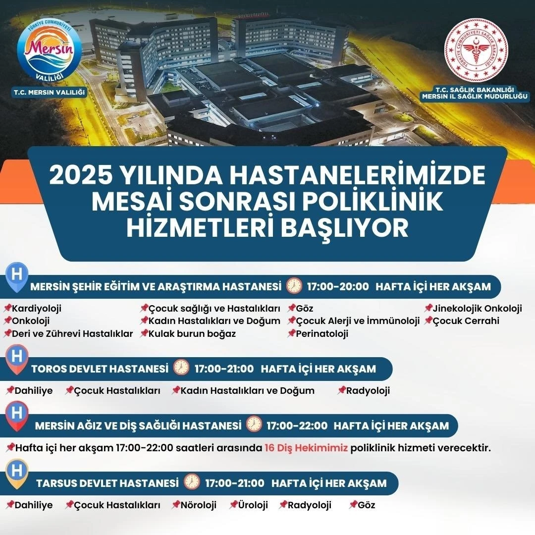 Toros Devlet Hastanesinde hafta içi her akşam 17.00-21.00 saatleri arasında dahiliye, çocuk hastalıkları, radyoloji, kadın hastalıkları ve doğum bölümlerinde, Tarsus Devlet Hastanesinde hafta içi her akşam 17.00-21.00 saatleri arasında dahiliye, çocuk hastalıkları, nöroloji, üroloji, radyoloji ve göz bölümlerinde, Mersin Ağız ve Diş Sağlığı Hastanesinde ise hafta içi her akşam 17.00-22.00 saatleri arasında 16 diş hekimimiz poliklinik hizmeti verecektir."