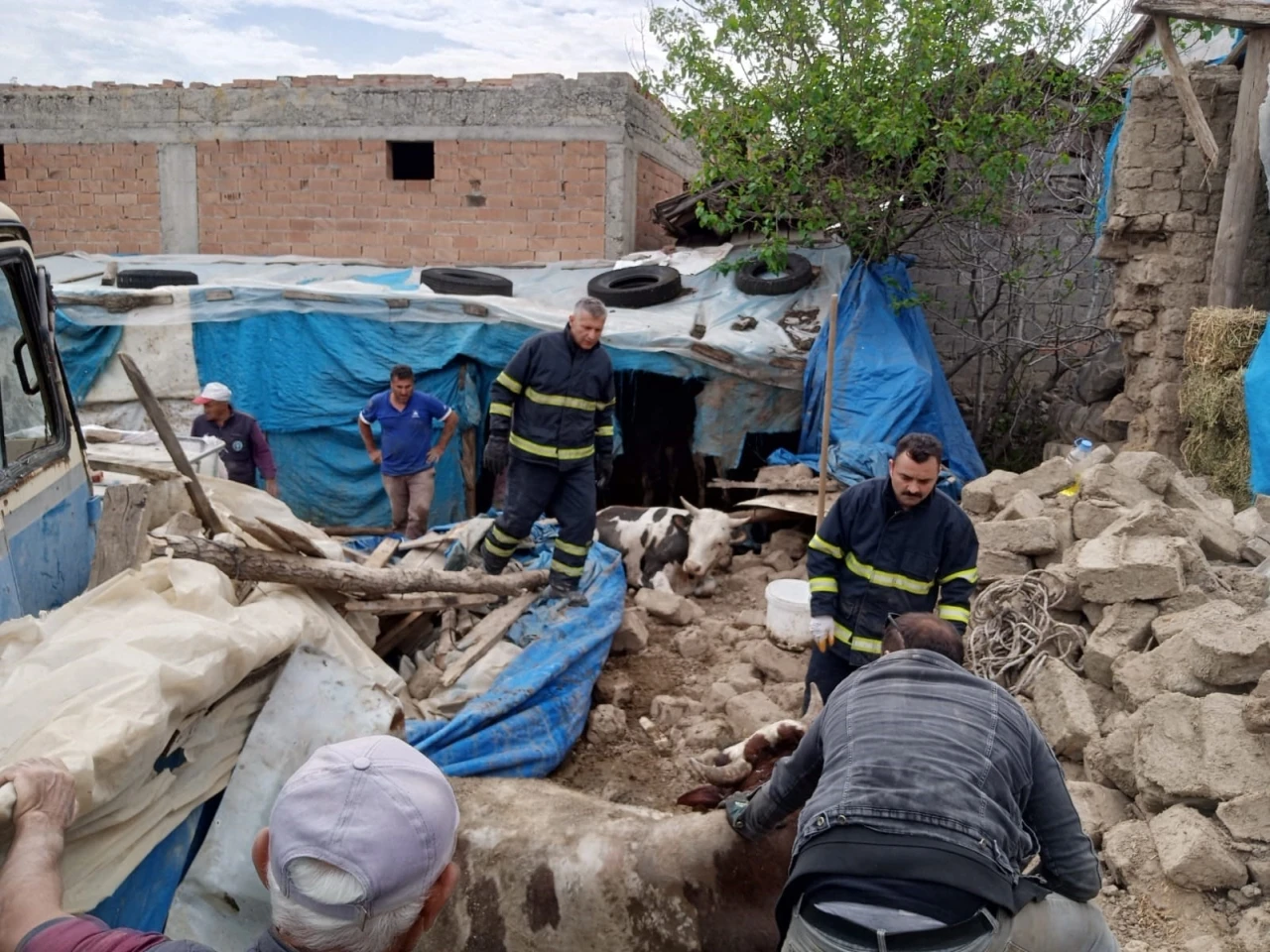 Amasya’nın Merzifon ilçesinde kerpiçten yapılan ahırın tavanı çöktü. Ahırın içinde göçük altında kalan 2 büyükbaş hayvanı itfaiyeciler kurtardı.