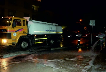 Gece gündüz demeden çalışmalarını sürdüren ekipler ilçemiz Menteşe, Cumhuriyet, Ulusal Egemenlik ve Kadıağa Caddelerinin kaldırımlarında tazyikli suyla yıkama ve deterjanlı su ile dezenfekte çalışmaları gerçekleştirdi.