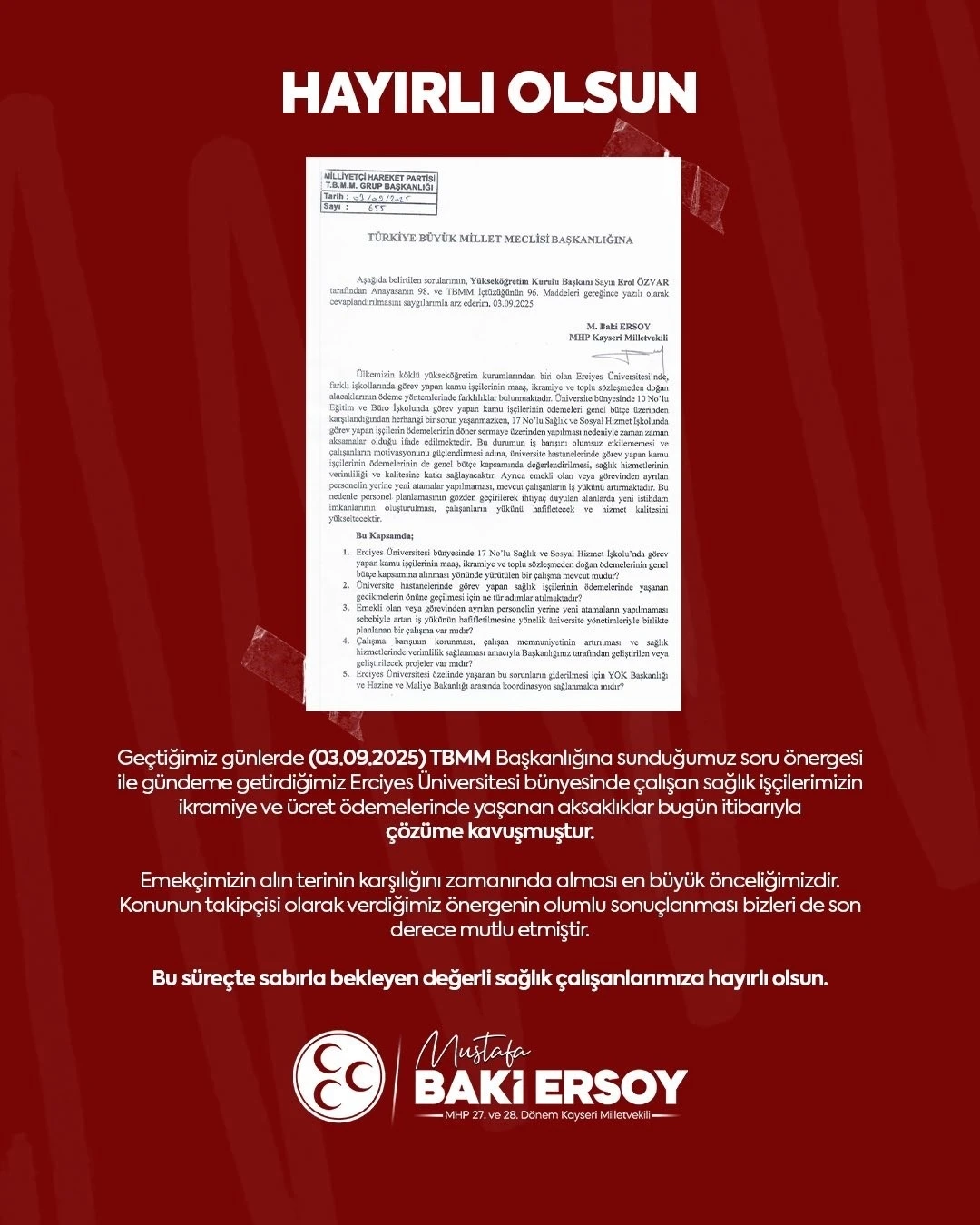 Milliyetçi Hareket Partisi (MHP) Kayseri Milletvekili Baki Ersoy, Erciyes Üniversitesi’nde (ERÜ) görev yapan sağlık personellerinin ikramiye ve ücret ödemelerindeki sorunların çözüme kavuşturulduğunu duyurdu.