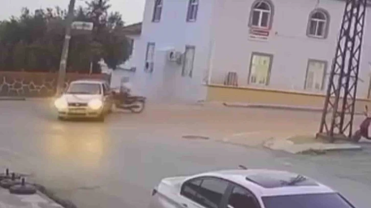 Hatay’ın Erzin ilçesinde bir motosikletin otomobile ok gibi saplandığı ve sürücüsünün havaya uçtuğu anlar güvenlik kamerasına yansıdı.