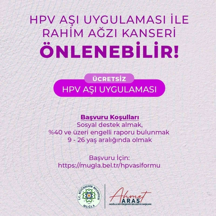 Türkiye’de önemli bir halk sağlığı sorunu olan HPV (İnsan Papilloma Virüsü) virüsü kaynaklı kanser vakaları son yıllarda artma eğilimi göstermesinden dolayı Muğla Büyükşehir Belediyesi 9-30 yaş aralığındaki kız çocuklarına ve kadınlara yönelik rahim ağzı kanseri aşısı yapmak için çalışmaları başlattı.