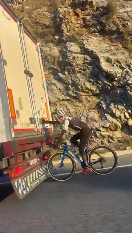 Muğla-Antalya Karayolu’nda bir kamyonun arkasına tutunarak hızla ilerlemeye çalışan bisiklet sürücüsünün tehlikeli yolculuğu, amatör kameraya yansıdı.