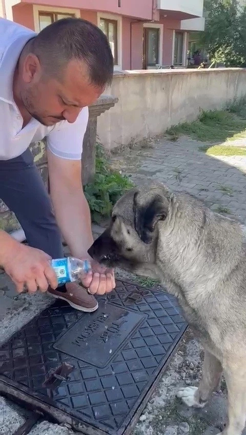 Düzce’de aşırı sıcaklar insanlar kadar sokak hayvanları da etkiledi. Susayan bir sokak köpeğini fark eden mahalle muhtarı eliyle köpeğe su içirdi. O anları ise mahalle sakini görüntülerken muhtarın bu hareketi sosyal medya büyük beğeni topladı.