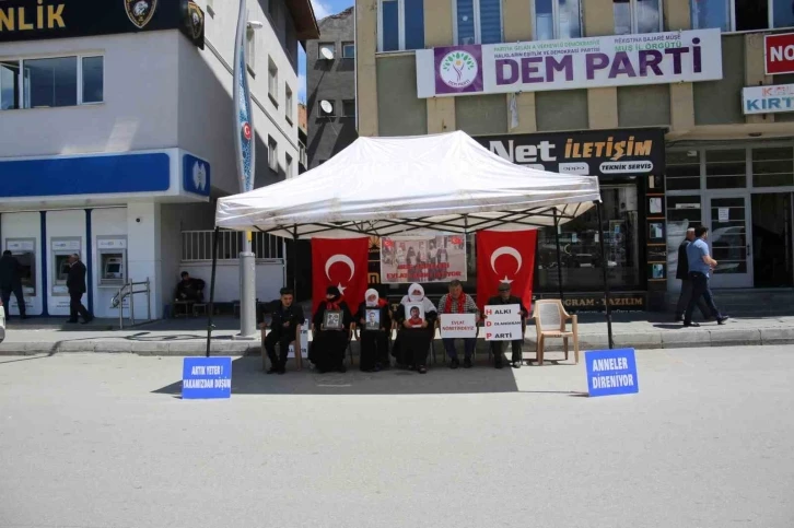 Muş’ta çocukları terör örgütü PKK tarafından kaçırılan aileler, DEM Parti il binası önündeki eylemlerini sürdürüyor.