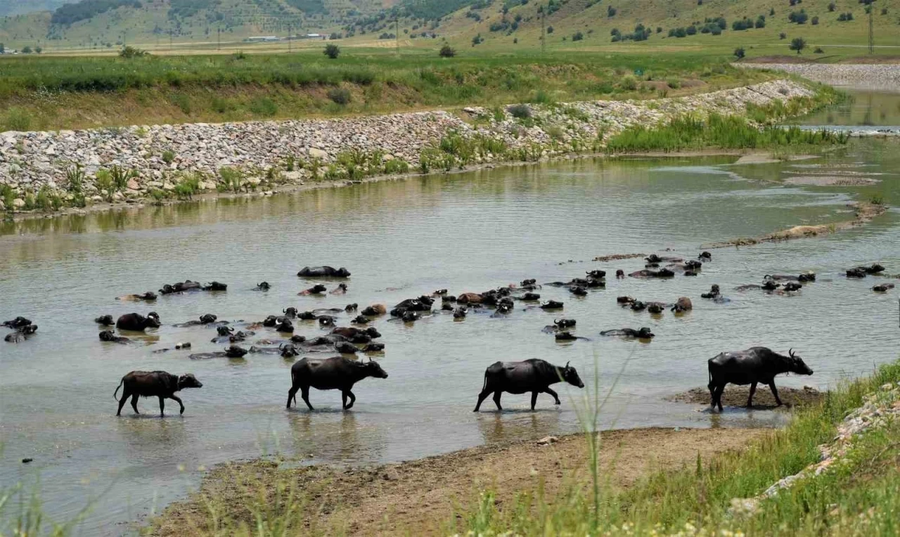 Muş’un Hasköy ilçesinde, sıcakların artmasıyla Karasu Nehri ve göletlerde serinleyen mandalar, bu sayede hastalıklardan korunuyor. Mandaların suya girdiği anlar ise Afrika’yı andırıyor.