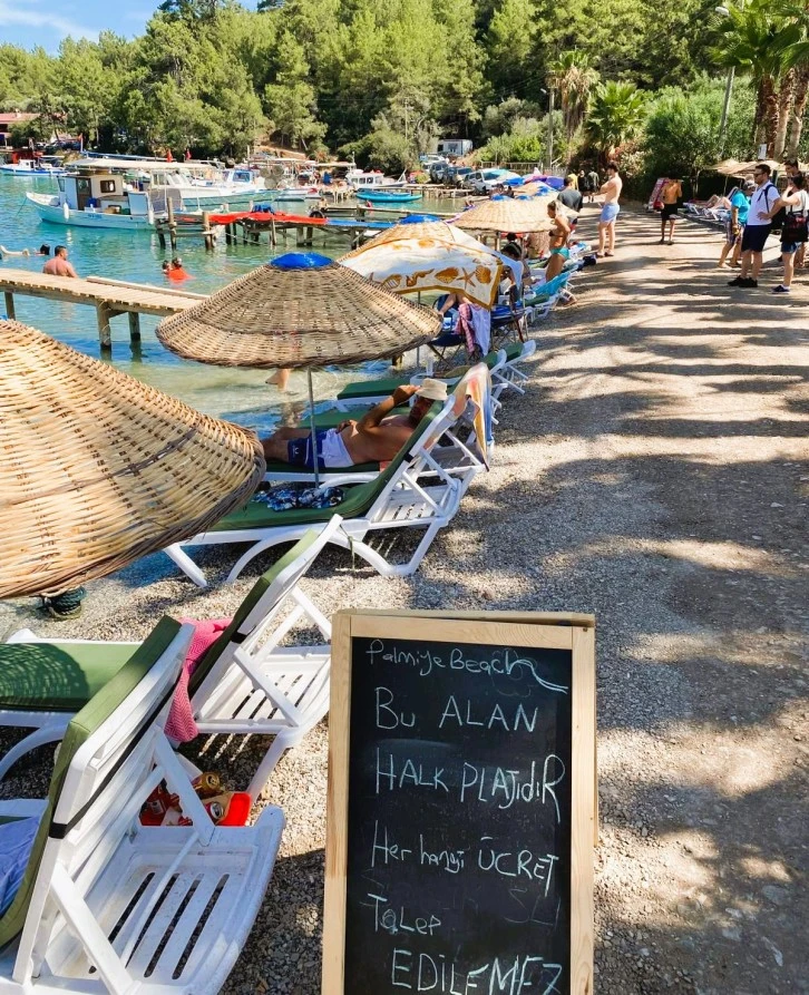 Plaja Menteşe Belediyesi ekipleri tarafından “Burası Halk Plajıdır Ücret Talep Edilemez” yazılması dikkat çekti.