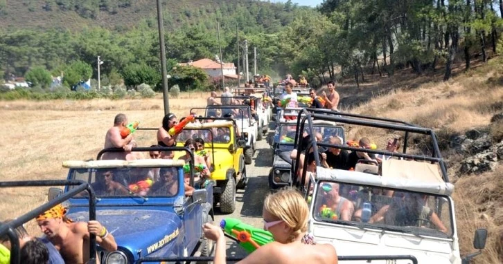 Muğla’nın Marmaris ilçesinde cip safariye katılarak tozlu topraklı yollardan geçip önce toza belenen ve peşinden de su savaşlarında çamurdan heykel olmanın bedeli bin lira. Yerli ve yabancı turistlerin ilgi gösterdiği cip safari turlarına Marmaris’te 9 günlük Kurban Bayramı süresince 6 bin kişiye yakın macera severin katıldığı tahmin ediliyor.
