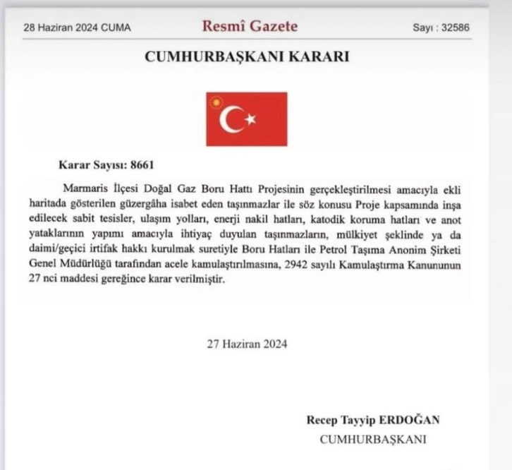 Marmaris İlçesi Doğal Gaz Boru Hattı Projesinin gerçekleştirilmesi amacıyla ekli haritada gösterilen güzergâha isabet eden taşınmazlar ile söz konusu Proje kapsamında inşa edilecek sabit tesisler, ulaşım yolları, enerji nakil hatları, katodik koruma hatları ve anot yataklarının yapımı amacıyla ihtiyaç duyulan taşınmazların, mülkiyet şeklinde ya da daimi/geçici irtifak hakkı kurulmak suretiyle Boru Hatları ile Petrol Taşıma Anonim Şirketi Genel Müdürlüğü tarafindan acele kamulaştırılmasına, 2942 sayılı Kamulaştırma Kanununun 27 nci maddesi gereğince karar verilmiştir. 27 Haziran 2024 Recep Tayyip ERDOĞAN CUMHURBAŞKANI