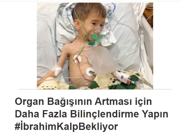 Doğuştan kalp yetmezliği hastası olan 2,5 yaşındaki İbrahim’in artık kalbi dayanamıyor ve kalp nakli yapılması gerekiyor. Artık kalbi dayanamadığı için kalp nakli yapılması gerektiğini duyuran change.org’da imza kampanyası başlatıldı. Kampanyada, “Ülkemizde organ bağışının çok az olması ve mevcut kriterler nedeniyle İbrahim gibi nakil bekleyen çok sayıda kişi var. İbrahim’in ailesi, bilinçlendirme çalışmalarının artmasını ve organ bağışı yapan kişilerin vefatından sonra bir de ailesinden onay alınması şartının kaldırılmasını talep ediyor” denildi.