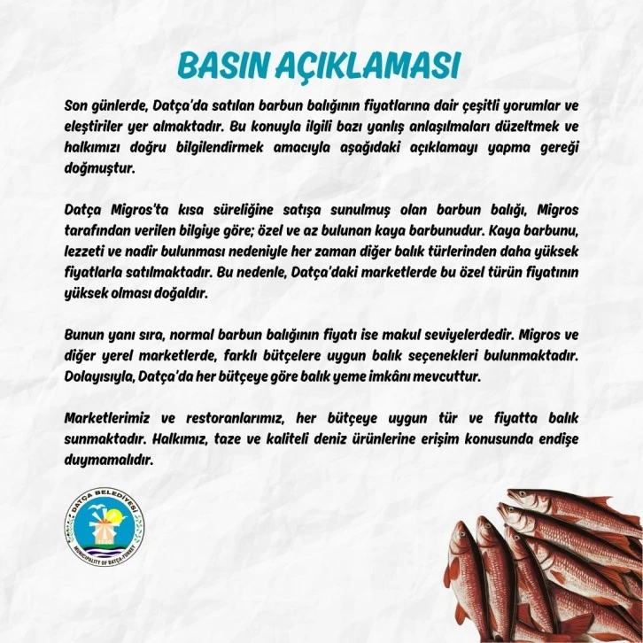 Konunun sosyal medyada gündemde kalmasının ardından Datça Belediyesi basın açıklaması yaparak, “Son günlerde, Datça’da satılan Barbun Balığının fiyatlarına dair çeşitli yorumlar ve eleştiriler yer almaktadır. Bu konuyla ilgili bazı yanlış anlaşılmaları düzeltmek ve halkımızı doğru bilgilendirmek amacıyla aşağıdaki açıklamayı yapma gereği doğmuştur. Datça Migros'ta kısa süreliğine satışa sunulmuş olan Barbun Balığı, Migros tarafından verilen bilgiye göre; özel ve az bulunan Kaya Barbunu’dur. Kaya Barbunu, lezzeti ve nadir bulunması nedeniyle her zaman diğer balık türlerinden daha yüksek fiyatlarla satılmaktadır. Bu nedenle, Datça’daki marketlerde bu özel türün fiyatının yüksek olması doğaldır” denildi.