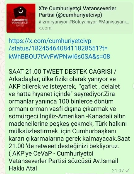 İsmail Hakkı Atal’ın sosyal medya paylaşımı şöyle: “ Ülke fiziki olarak yanıyor ve AKP bilerek ve isteyerek, "gaflet, delalet ve hatta hıyanet içinde" seyrediyor. Zira ormanlar yanınca 100 binlerce dönüm ormanı orman vasfı dışına çıkarmak ve sömürgeci İngiliz-Amerikan -Kanadalı altın madencilerine peşkeş çekmek, Türk halkını mülksüzleştirmek için Cumhurbaşkanı kararı çıkarmalarına gerek kalmayacak. Saat 21.00 'de retweet desteğinizi bekliyoruz. AKP'ye CeVaP - Cumhuriyetçi Vatanseverler Partisi sözcüsü Av. İsmail Hakkı Atal.”