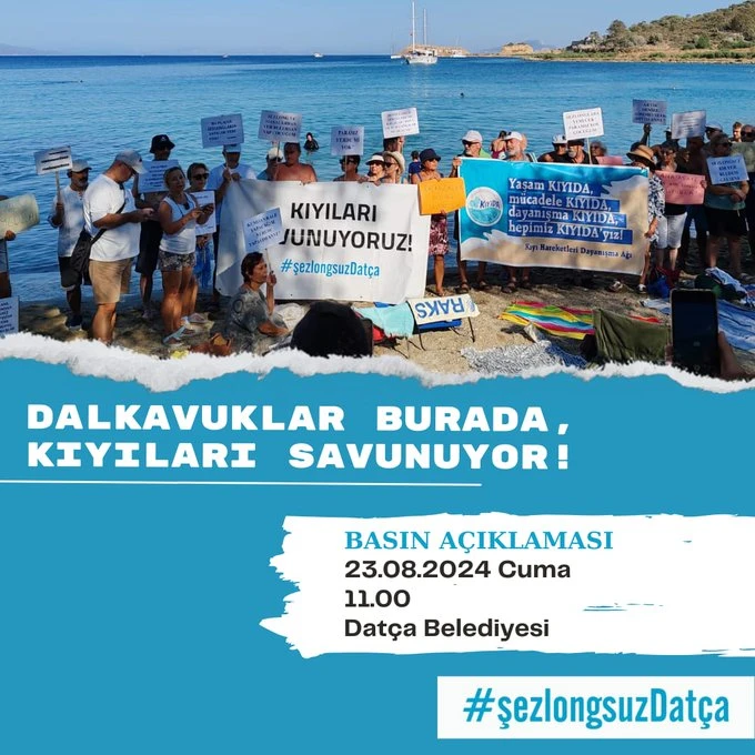 Sosyal medyadan da “Kıyıları savunuyoruz #şezlongsuzDatça”, “Yaşam KIYIDA, mücadele KIYIDA, dayanışma KIYIDA hepimiz KIYIDA yız” pankartlarının yer aldığı duyuruda şu bilgiler verildi: Dalkavuklar burada, kıyıları savunuyor! Basın açıklaması 23.08.2024 Cuma 11.00. Datça Belediyesi. #şezlongsuzDatça”