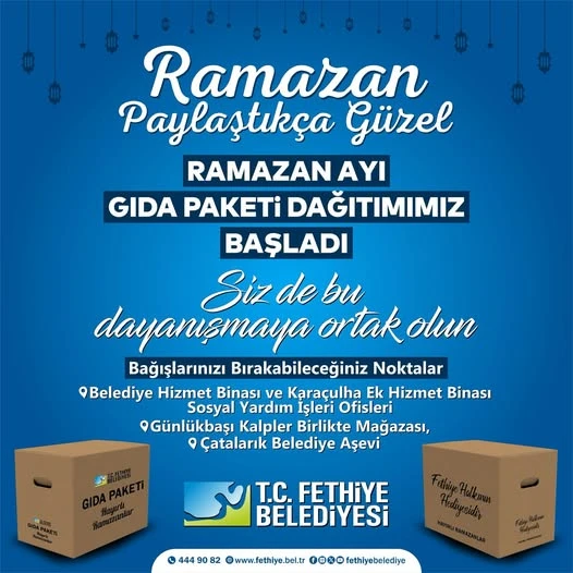 Fethiye Belediye Başkanı Alim Karaca ise, “11 ayın sultanı Ramazan ayı yaklaşırken, önceki yıllarda olduğu gibi, gıda yardımı hazırlıklarımızı tamamladık. İhtiyaç sahibi yurttaşlarımız için gıda kolisi bağışında bulunmak isteyen vatandaşlarımızın desteklerini kabul ediyor, yardımları doğrudan sahiplerine ulaştırıyoruz” ifadelerini kullandı.