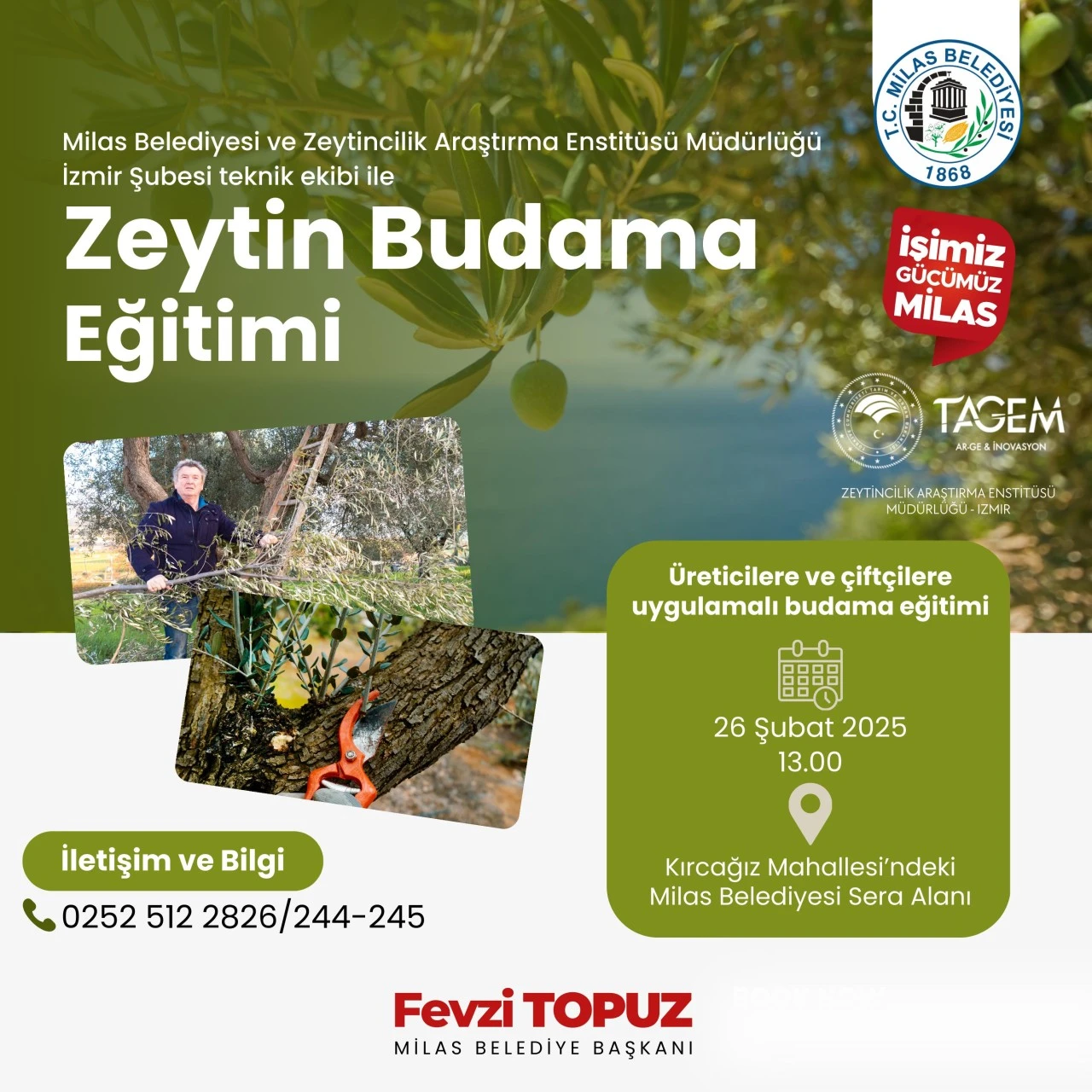 AB Coğrafi İşaret tescilli zeytin ve zeytinyağına sahip olan Milas’ta üreticinin bilinçlenmesi ve tarımsal üretim kapasitesini arttırmak açısından önemli bir çalışma olacak zeytin budama eğitimi Kırcağız Mahallesi’nde bulunan Milas Belediyesi’ne ait sera alanında 26 Şubat 2025 Çarşamba günü saat 13.00’te gerçekleştirilecek.