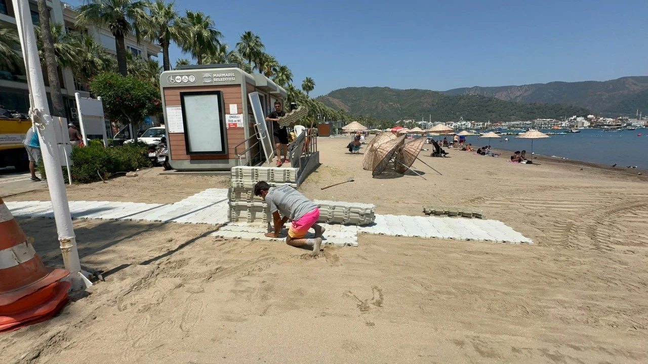Marmaris Halk Plajı’na engelli bireylerin denize daha rahat ulaşabilmesi için engelli rampası kuruluyor. Belediye ekipleri tarafından başlatılan çalışma kapsamında özel donanıma sahip rampa, plaja yerleştirilmeye başlandı. Marmaris Belediyesi yetkilileri, yaz boyunca plajlara erişimde eşitlik sağlamak adına benzer uygulamaların farklı noktalarda da hayata geçirileceğini belirtti.