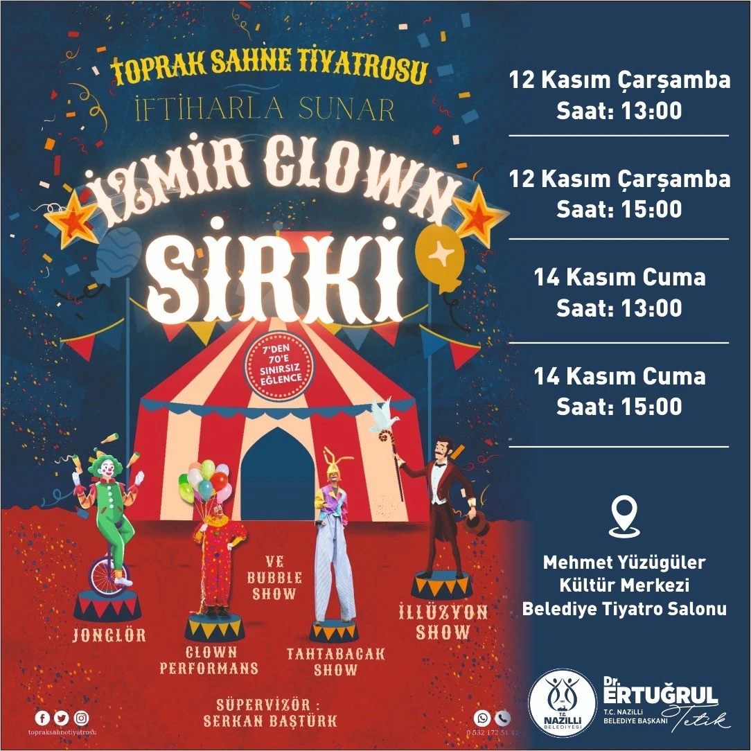 Toprak Sahne Tiyatrosu tarafından sahnelenen "İzmir Clown Sirki" gösterisi, Nazilli Belediyesi aracılığıyla birbirinden renkli performanslarıyla çocuklara neşeli dakikalar yaşatacak. Clown performansları, jonglör, tahta bacak, illüzyon ve bubble show gibi birçok eğlenceli gösterinin yer alacağı sirk, 12 Kasım Çarşamba günü saat 13.00 ve 15.00’te, 14 Kasım Cuma günü yine saat 13.00 ve 15.00’te Mehmet Yüzügüler Kültür Merkezi’nde çocuklarla buluşacak. Nazilli Belediyesi Kültür ve Sosyal İşler Müdürlüğü tarafından organize edilen etkinliğe katılım ücretsiz olacak. Vatandaşlar, ücretsiz biletlerini Kültür ve Sosyal İşler Müdürlüğü’nden temin edebilecek. Tüm çocukları etkinliğe davet eden Nazilli Belediye Başkanı Dr. Ertuğrul Tetik; "Ara tatilde çocuklarımızın keyifli vakit geçirmelerini istedik. Onların yüzündeki gülümseme bizim en büyük mutluluğumuz" ifadelerini kullandı.