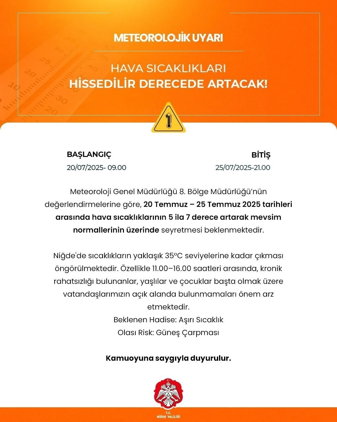 Meteoroloji Genel Müdürlüğü 8. Bölge Müdürlüğü’nün değerlendirmelerine göre; 20 Temmuz - 25 Temmuz 2025 tarihleri arasında hava sıcaklıklarının 5 ila 7 derece artarak mevsim normallerinin üzerine çıkması bekleniyor. Niğde Valiliği tarafından yapılan açıklamada; özellikle 11.00 ile 16.00 saatleri arasında açık alanda bulunmanın sağlık açısından risk oluşturabileceği, kronik rahatsızlığı olanlar, yaşlılar ve çocuklar başta olmak üzere tüm vatandaşların sıcak havalarda tedbirli olmaları gerektiği ifade edildi.