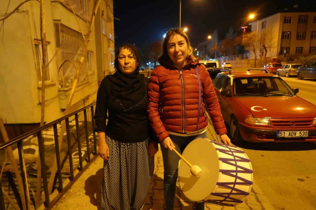 Niğde’nin kovboy muhtarı Tuğba Somkaya, davul çalanın kendisi olduğunu fark edince balkondan seslenenler ve onu görüp sokağa inenlerle de sohbet ederek Ramazan aylarını tebrik ediyor.