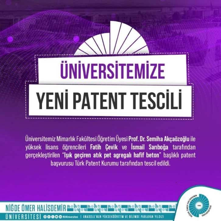Niğde Ömer Halisdemir Üniversitesi Mimarlık Bölümü Öğretim Üyesi Prof. Dr. Semiha Akçaözoğlu ile yüksek lisans öğrencileri Fatih Çevik ve İsmail Sarıboğa tarafından gerçekleştirilen ’Işık geçiren atık pet agregalı hafif beton’ başlıklı patent başvurusu Türk Patent Kurumu tarafından tescil edildi.