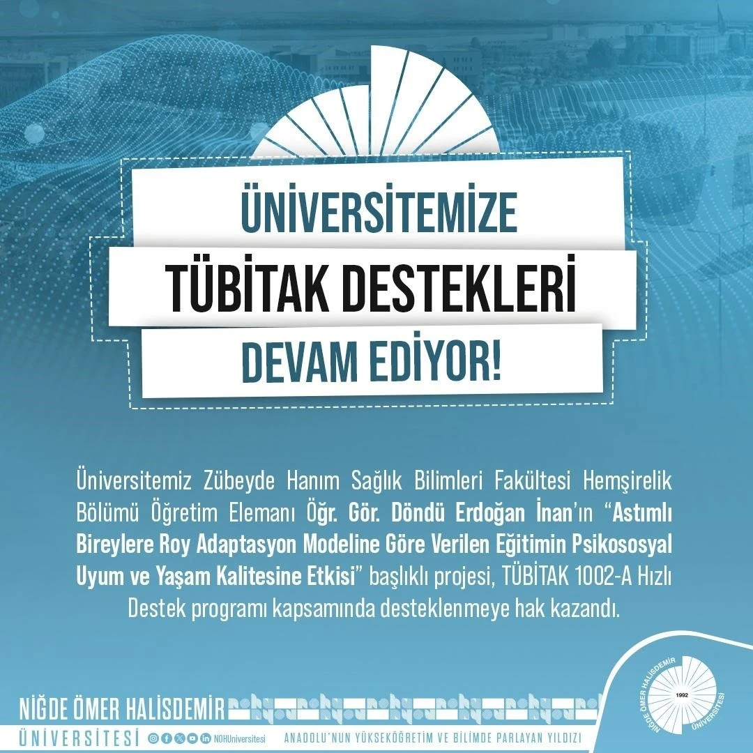 Niğde Ömer Halisdemir Üniversitesi Zübeyde Hanım Sağlık Bilimleri Fakültesi Hemşirelik Bölümü Öğretim Elemanı Öğretim Görevlisi Döndü Erdoğan İnan’ın; ’Astımlı Bireylere Roy Adaptasyon Modeline Göre Verilen Eğitimin Psikososyal Uyum ve Yaşam Kalitesine Etkisi’ başlıklı projesi, TÜBİTAK 1002-A Hızlı Destek programı kapsamında desteklenmeye hak kazandı.