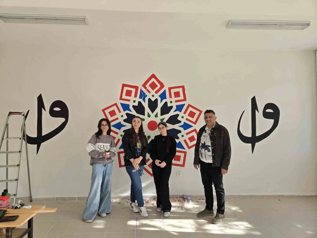 Öğrenciler, İslam hat sanatının önemli unsurları olan "Allah" lafzı ve "Vav" harfini, Selçuklu yıldızı motifleriyle harmanlayarak duvarlara titizlikle uyguladılar. Renklerin, çizgilerin ve derin anlamların buluştuğu bu çalışma sayesinde okuma salonunun duvarları, artık sadece bakılan değil, aynı zamanda düşündüren ve hissettiren birer sanat eserine dönüştü.