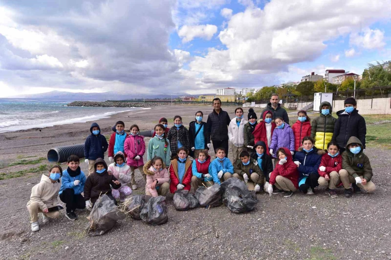 Bitlis’in Ahlat ilçesindeki öğrenciler Van Gölü kıyısında “Van Gölü Temiz Kalsın” sloganıyla çöp toplama etkinliği yaptı.