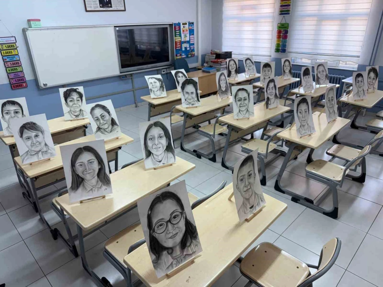 Atatürk İlkokulu’nda sınıf öğretmeni olan Ahmet Mesut Yücel, öğrencilerine bu yıl karne hediyesi olarak sadece bir kâğıt değil, bir ömür boyu unutamayacakları bir hatıra verdi. Her bir öğrencisinin kara kalem portresini çalıştı. Öğrencilerden kimi hayretle, kimi gözleri dolarak hediyelerini aldı.