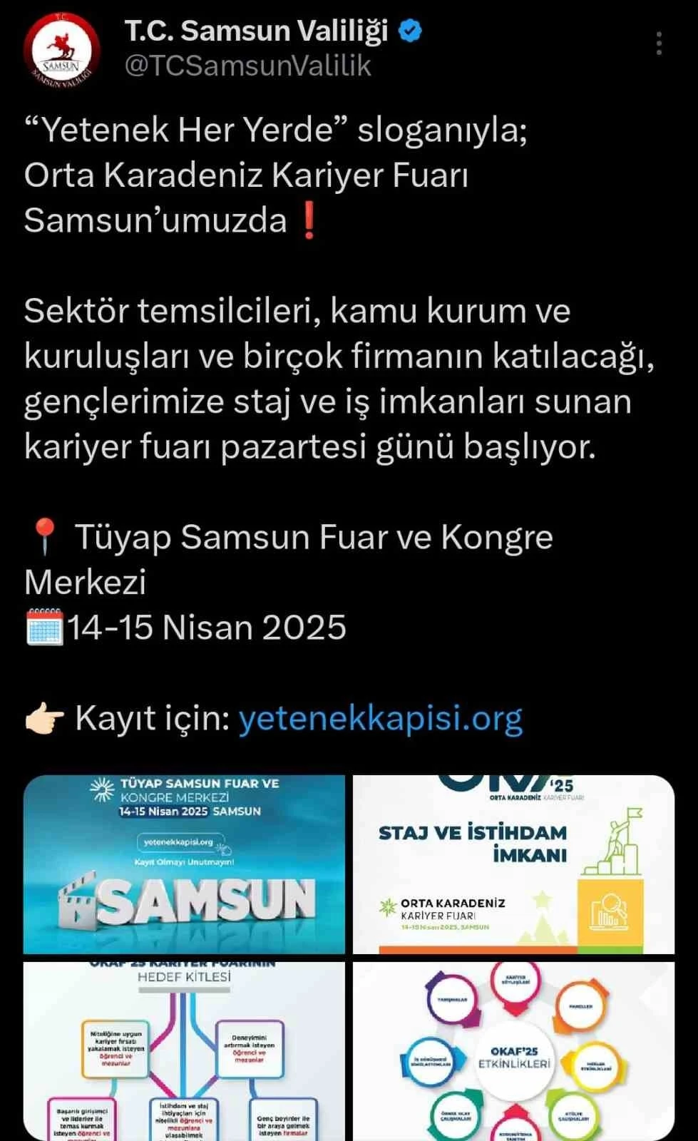 Samsun Valiliği sosyal medya hesaplarından yapılan paylaşımda, "’Yetenek Her Yerde’ sloganıyla Orta Karadeniz Kariyer Fuarı Samsun’umuzda. Sektör temsilcileri, kamu kurum ve kuruluşları ve birçok firmanın katılacağı, gençlerimize staj ve iş imkanları sunan kariyer fuarı pazartesi günü başlıyor" ifadelerine yer verildi.