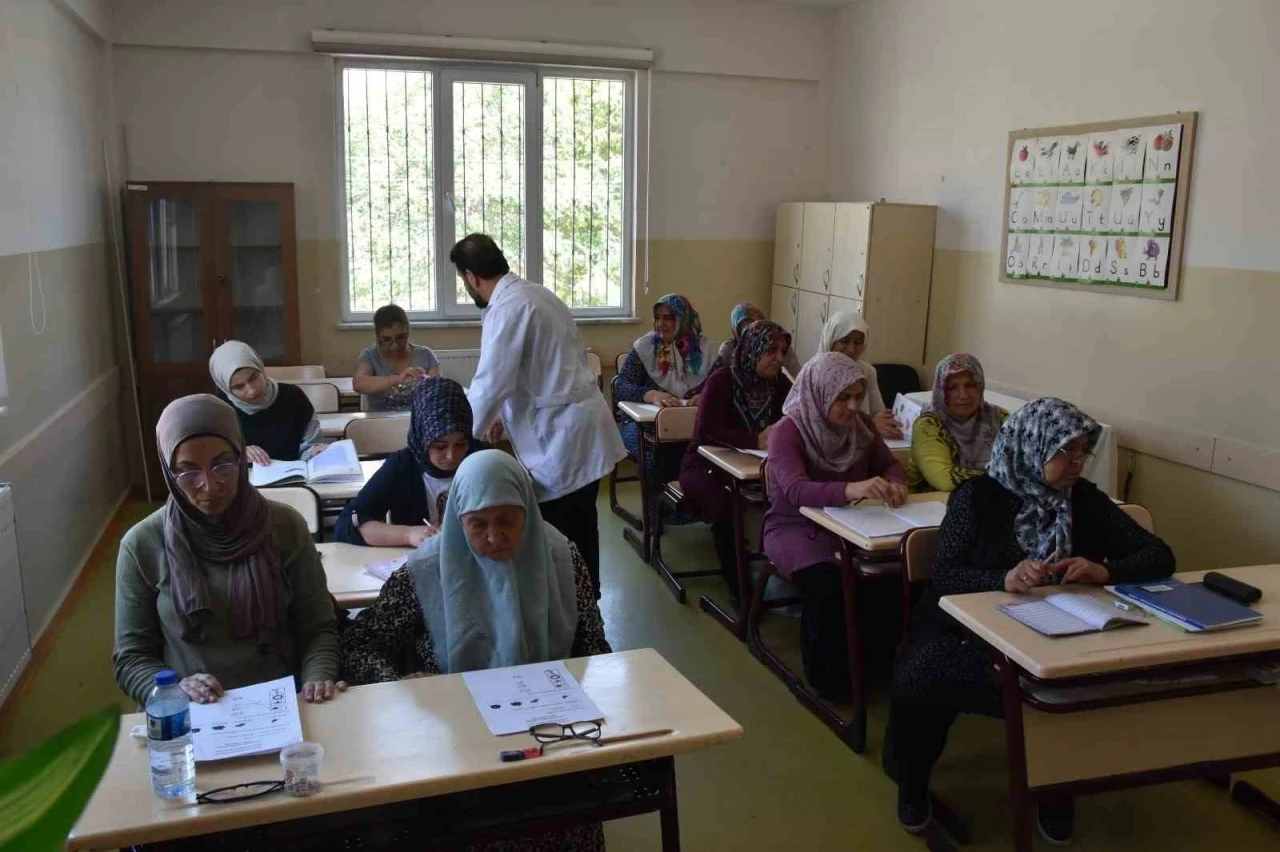 Okuma yazma kursunda kısa sürede gösterdikleri gayretle büyük ilerleme sağlayan kadınlar, azim ve gayretleriyle diğer kadınlara da örnek oluyor.