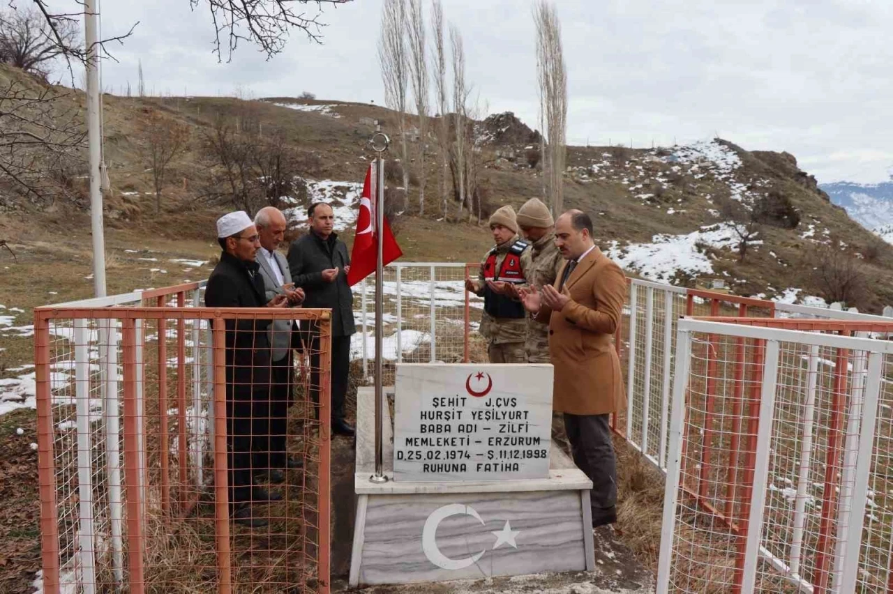 Erzurum’un Oltu ilçesinde Kaymakam Mustafa Çelik, 26 yıl önce şehit olan Hurşit Yeşilyurt’un kabrini ziyaret etti.