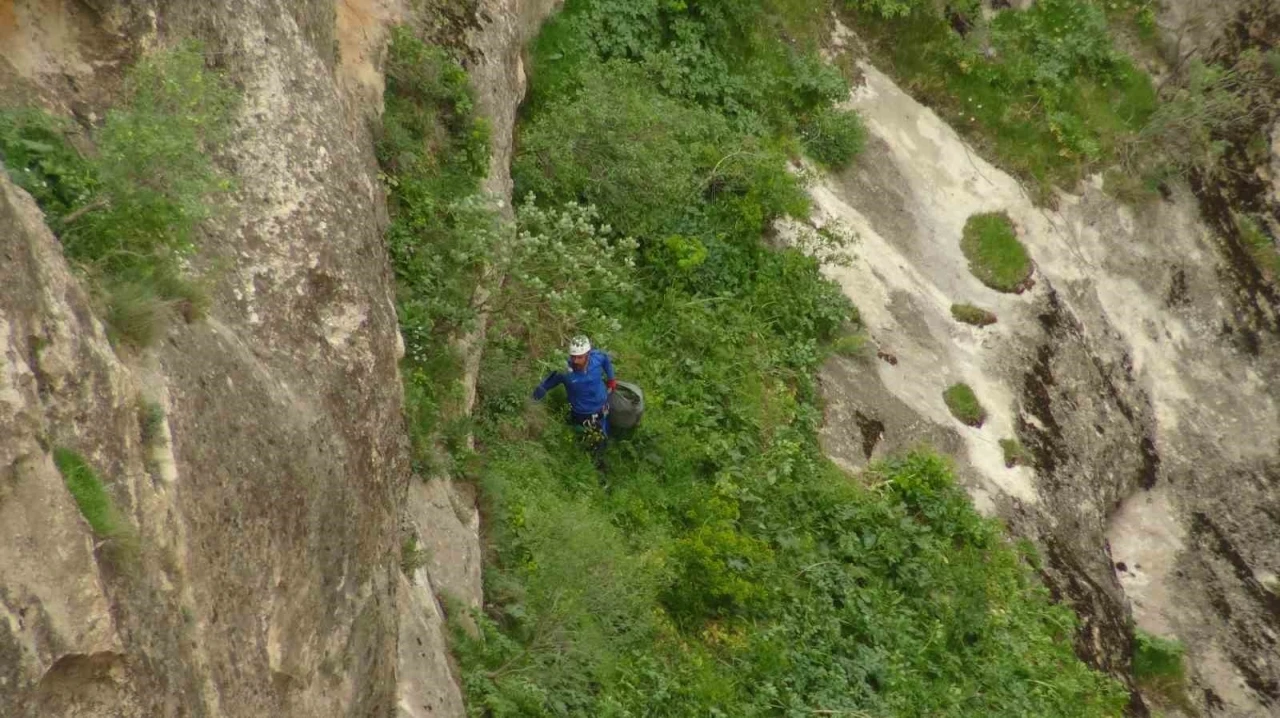 Batman’ın Gercüş ilçesinde beden eğitimi öğretmeni Yalçın Yıldız, her türlü tehlikeyi göze alarak şifa için 400 metrelik kayalıklardan halat yardımıyla inerek ’yılan otu’ topladı.