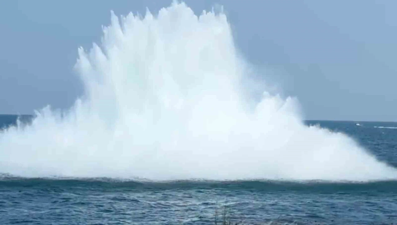 Güvenlik önlemlerinin alınmasının ardından mayın kontrollü şekilde patlatılarak imha edilirken, patlamayla birlikte deniz suyu, yüzeyin yaklaşık 20 metre yukarısına yükseldi.