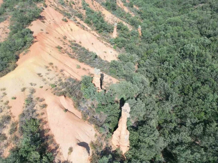 Afyonkarahisar’ın Bolvadin ilçesinde doğa gezisine çıkan bir vatandaş ormanlık alanda havalandırdığı dron ile peri bacaları keşfetti.