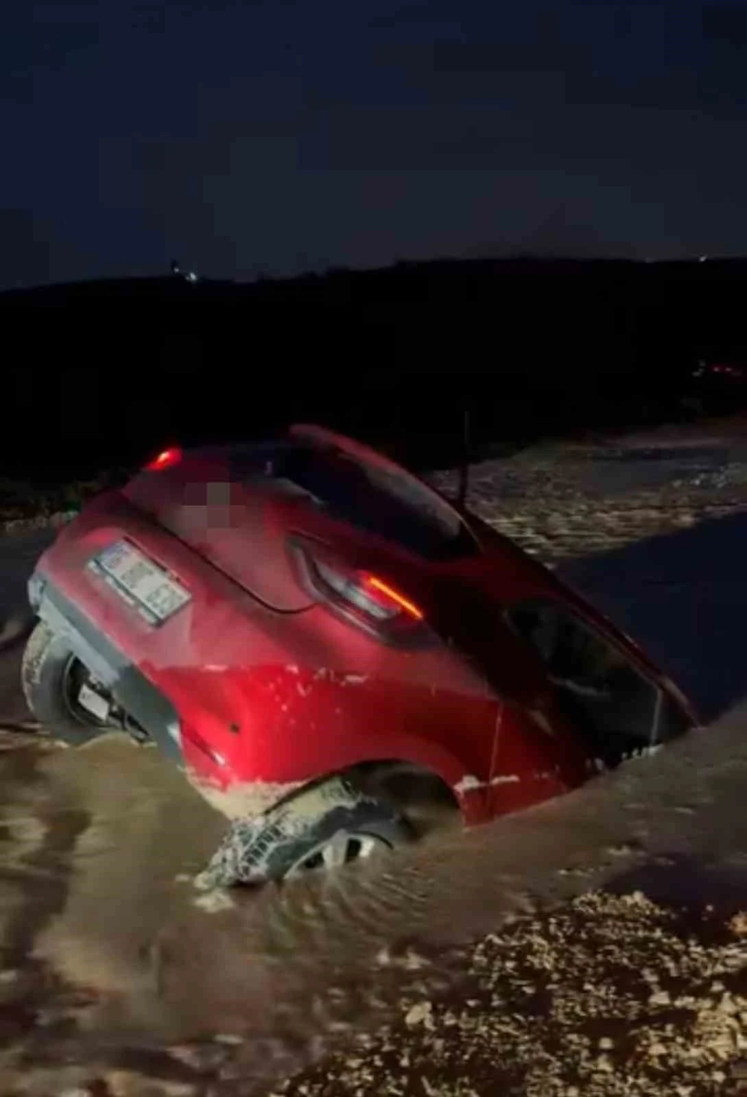 Bursa’nın Nilüfer ilçesinde yol çalışması nedeniyle oluşan çamura giren otomobil bataklığa saplandı. Araç yarıya kadar çamura gömülürken, sürücü otomobilden son anda çıkarak kurtuldu.